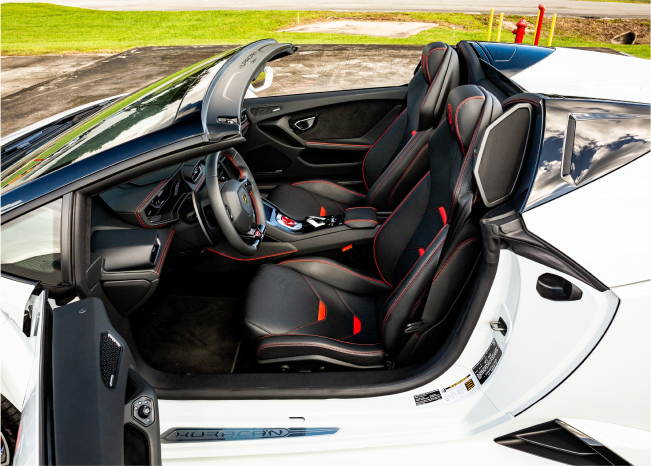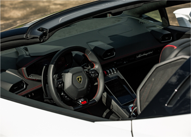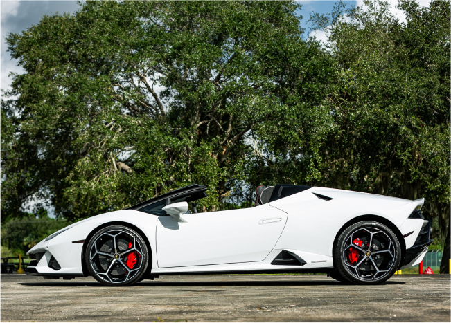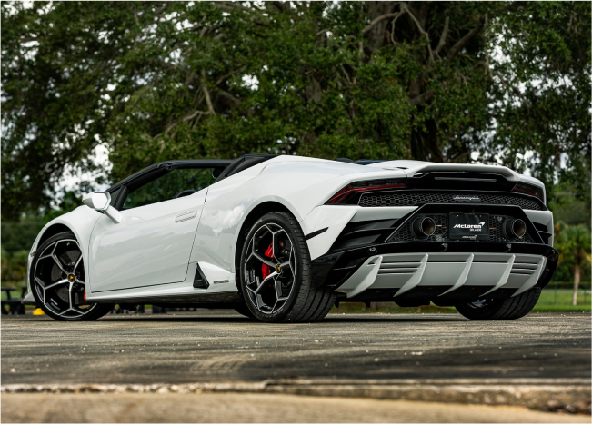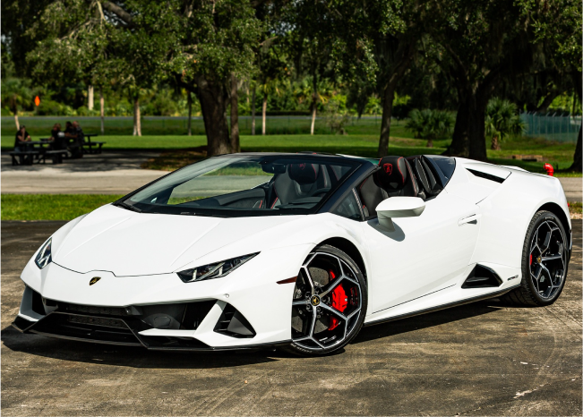 This white Huracan Evo Spyder emphasizes the car’s sculpted surfaces and clean, modern look. The light finish photographs beautifully in daylight or under city lights, highlighting every line. Open-air driving enhances the V10 experience while the chassis remains poised and responsive. Inside, premium materials and supportive seating keep you comfortable as you tour Miami’s districts. Select the white Evo Spyder for elegant visuals and vivid performance. It creates memorable entrances and striking images wherever you stop.