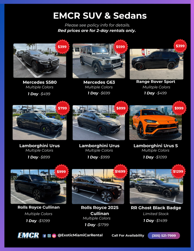 EMCR - Exotic Miami Car Rental 117 Google reviewsPosted on StarTrustindex verifies that the original source of the review is Google. Amazing customer service and great place to rent from fast and easy processPosted on Justin BuchananTrustindex verifies that the original source of the review is Google. Hands down the best exotic car rental company in Miami! Unbeatable prices, top-tier customer service. Big shoutout to Jay — he's the guy to go to!Posted on Ethan MajewskiTrustindex verifies that the original source of the review is Google. Ride was great, fun ride. People that run the company are great and easy to work with.Posted on Shawn RamirezTrustindex verifies that the original source of the review is Google. Came to Miami on short notice and needed a luxury whip ASAP Jay hooked us up with a Ferrari F8, just so convenient and nice sleek car, we had a little extra time and decided to rent a yacht out as well, 10 out of 10 experience you even get a whole crew and personal captain, when we come back down we will definitely be coming back just bc how convenient it was he has even offered to pick up the car from our airport. W car rentalPosted on The Rejuvenation Bar LLCTrustindex verifies that the original source of the review is Google. We have used Exotic Miami in the past and every time the service is impeccable! Professional, on time, staff is super helpful and most of all the quality of the boat we used and the crew was by far the BEST!! We highly recommend them and will use them again.Posted on Gurpreet SinghTrustindex verifies that the original source of the review is Google. Bond parro gaddiya. Bad ass vibe. Soni naddi. Hit my my boy jay. Cheapest price in south Florida.Posted on Erkin SattarovTrustindex verifies that the original source of the review is Google. Best company to work with. I have worked with many. They have the best cars and most importantly very friendly and helpfull.Posted on G.Diddy EdwardsTrustindex verifies that the original source of the review is Google. Highly recommend! Very professional & accommodating!! I will most definitely rent from you guys again!Posted on RamonTrustindex verifies that the original source of the review is Google. Satisfecho con la atención de guillermo todo fue muy rápido e eficientePosted on Karim AbdelsalamTrustindex verifies that the original source of the review is Google. The best rental place in Miami , highly recommend great prices and rates , communication is clear and amazing customer service , the cars are amazing
